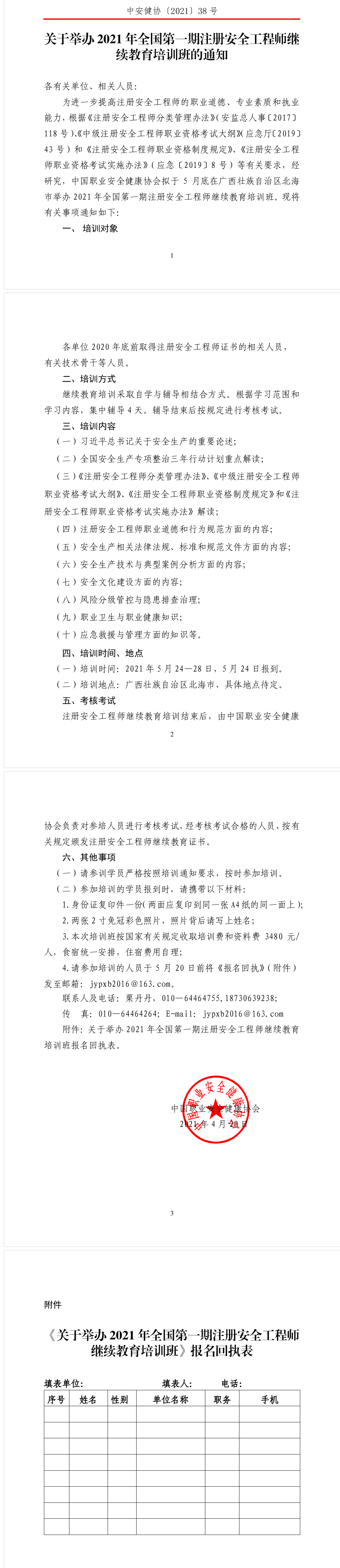 关于举办2021年全国第一期注册安全工程师继续教育培训班的通知